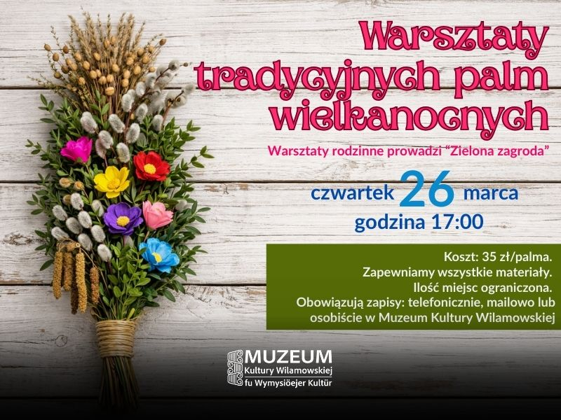 Zapraszamy na warsztaty tradycyjnych palm wielkanocnych. Warsztaty poprowadzi "Zielona Zagroda". Koszt 35 zł za palmę. Ilość miejsc ograniczona - obowiązują zapisy!